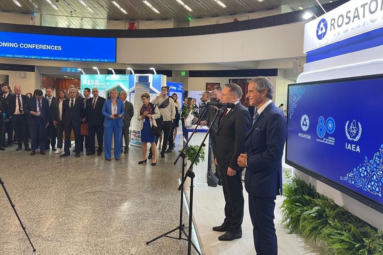 Перед началом работы Генеральной конференции с участием генерального директора МАГАТЭ Рафаэлем Мариано Гросси и генерального директора Государственной корпорации по атомной энергии «Росатом» Алексея Лихачёва состоялось торжественное открытие и обход российского выставочного стенда, посвященного 80-летию атомной отрасли.