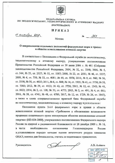 В соответствии с приказом федеральной службы по экологическому, технологическому и атомному надзору № 363 от 11 сентября 2017 г. положения пункта 3.4.4 федеральных норм и правил в области использования атомной энергии «Требования к обоснованию возможности продления назначенного срока эксплуатации объектов использования атомной энергии» (НП-024-2000), утвержденных постановление Федерального надзора России по ядерной и радиационной безопасности от 28 декабря 2000 г. № 16, в части необходимости согласования Госатомнадзором России в установленном порядке методик оценки остаточного ресурса элементов ОИАЭ, важных для безопасности, считать не подлежащим применению.